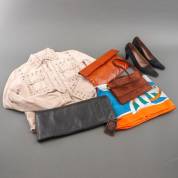 Paar zwarte suède pumps, uitvoering Gucci, maat 39 -gebruikssporen-, suède jasje met metalen studs, uitvoering REDvalentino maat S -gebruikssporen, één stud mist-, katoenen pareo met vlinders, uitvoering Battistoni, zwart lederen clutch met rits, uitvoering Principe, Italië, cognac lederen clutch met schuine banen, uitvoering Alexia, Rome en suède clutch, uitvoering Sergio Rossi
