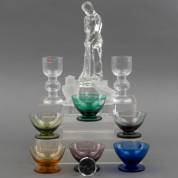 Zes carnaval coupeglazen, ontwerp Max Verboeket, uitvoering Kristalunie, Maastricht, 1956, in doos, paar kristallen glazen, model Ritari, ontwerp Timo Sarpaneva, uitvoering Iittala, Finland, 6cl, in doos, 11,5 cm, twee gesatineerde presse-papiers: uil en eend, uitvoering Goebel, Duitsland, persglazen presse-papier met logo van Glasfabriek Leerdam, en persglazen beeld van een glasblazer, uitvoering Euroglass Design, 25 cm