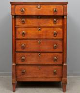 Eiken chiffonnière, de zes lades geflankeerd door halve kolommen, staand op taps toelopende poten, Hollands, eerste helft 19e eeuw, -defecten, krimpscheuren in de zijkanten-, 156 × 98 × 48 cm