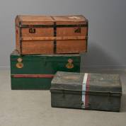 Drie hutkoffers, waarvan één groengelakt metalen, één met groengelakt metaal overtrokken, uitvoering kofferfabriek Vroom, Den Haag, en één houten met jute, 20e eeuw -gebruikssporen-, 52 × 100 × 50 cm