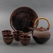 Nirdosh Petra van Heesbeen (1949), bruingeglazuurd keramisch theeservies bestaande uit: theepot, onderschaal en vier theekommen, jaren '80, onderschaal Ø 28 cm