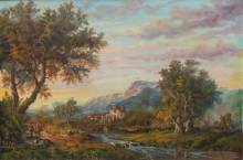 Schilderij: landschap met reizigers, rivier en kasteel, olieverf op doek, 20e eeuw, r.o. gesigneerd J. Landman, 100 × 150 cm