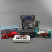 Vier kunststof en metalen modelauto's en één modelmotor, diverse uitvoeringen en schalen, modern