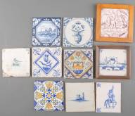 Tien aardewerk tegels, waarvan twee in lijst, met diverse blauw-witte en polychrome decors, 18e tot 20e eeuw -defecten-, 13 × 13 cm