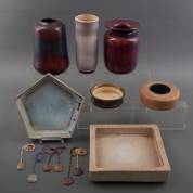 Zeven keramische objecten waaronder vazen en schalen, daarbij: zes keramische hangers, alle uitvoering Zaalberg, 25 × 18 cm