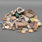 Verzameling van diverse mineralen en fossielen, grootste 26,5 × 9 cm