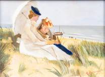 Schilderij: moeder en dochter in de duinen, olieverf op board, r.o. gesigneerd Rozemarijn, 21e eeuw, 15 × 20 cm