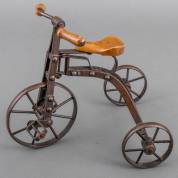 Smeedijzeren driewielertje met houten zadel en handgrepen, 24 × 28 × 21 cm