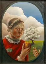 Nol Manten (1944-1991), meisje met appel, marouflé, niet gesigneerd, verso getekend door weduwe als certificaat van echtheid en gedateerd ca. 1982 -craquelé-, 40 × 30 cm