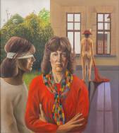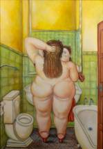 Schilderij: vrouw voor spiegel, olieverf op doek, in de stijl van Fernando Botero maar niet van zijn hand, niet gesigneerd, modern, 100 × 70 cm