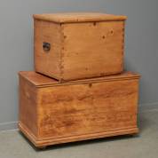 Twee grenen kisten, waarvan één met gezwarte handgrepen, tweede helft 20e eeuw -gebruikssporen, oude houtwormgaatjes-, 60 × 100 × 55 cm