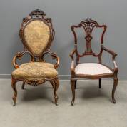 Mahonie en gezwart houten stoel met gobelin bekleding, Willem III -bekleding sleets-, 106 × 57 × 70 cm, en mahonie armstoel met stoffen zitting, Chippendale-stijl, 19e eeuw, 96 × 56 × 60 cm
