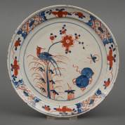 Delfts aardewerk 'pannenkoek' bordje met Imari decor van vogel op tak, 18e eeuw -randschilfers-, Ø 22 cm
