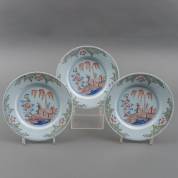 Drie Delfts aardewerk borden met polychroom chinoiseriedecor: tuin, 18e eeuw -één met sterbarst, randschilfers-, Ø 23,3 cm
