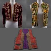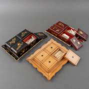 Drie sets fichedoosjes op onderschotels, waarvan twee lakwerk, alle 19e eeuw -één dekseltje met rood lakwerk defect-, afmetingen dienblaadjes 17 × 22,5 cm