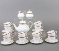 Vijftiendelig porseleinen theeservies met blauw en gouden randdecor, bestaande uit: theepot, suikerpot, roomkan, twaalf kop-en-schotels, uitvoering Eschenbach, Beieren, Duitsland, theepot 24 × 18 × 14 cm