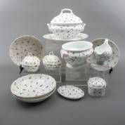 Porseleinen serviesgedeelte met strooibloemdecor, Frankrijk, begin 19e eeuw, bestaande uit: vier diepe borden, bedekte terrine op onderschotel, twee kleine bedekte terrines, sauskom, terrine zonder deksel, bedekte suikerpot, en klein schaaltje, bord Ø 23 cm