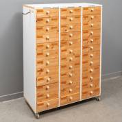 Witte gelamineerde kast met 36 vurenhouten laatjes -gebruikssporen-, 89,5 × 124 × 40 cm