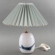 Witte glazen lampvoet met grijs en blauw gekleurde rand en geplisseerde kap, ontwerp Michael Bang, uitvoering Holmegaard, Royal Copenhagen, Denemarken, circa 1980, 46 × 42 cm inclusief kap
