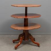 Mahoniegefineerde inklapbare etagèretafel met drie gecontourneerde bladen, staand op vierspantpoot met wieltjes, 19e eeuw, 99 × 70 × 47 cm