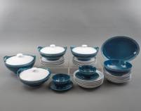 Porseleinen serviesgedeelte met blauwgroen decor, uitvoering Eschenbach, Duitsland, derde kwart 20e eeuw, bestaande uit: tien kleine borden, tien diepe borden, en acht dienschalen waarvan vier bedekt, maat bord Ø 20,5 cm