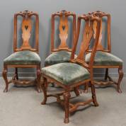Vier notenhouten stoelen met gesneden rug en onderstel, de zitting bekleed met blauw velours, barok-stijl, circa 1900