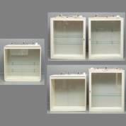 Vijf witgelakte vitrinekasten met glazen schuifdeuren, afmetingen grootste 114 × 97 × 33 cm
