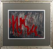 Schilderij: abstracte compositie in zwart en rood, olieverf op papier, r.o. onduidelijk gesigneerd, 49,5 × 64,5 cm