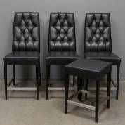 Vier zwarte krukken, waarvan drie met en één zonder rugleuning, alle met zwarte lederen bekleding en belijmd met aluminium op de regelverbinding tussen de poten, modern, met rugleuning 120 × 50 × 53 cm