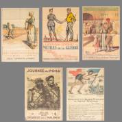 Eerste Wereldoorlog: vijf affiches. 1915-1920. Circa 120 × 80 cm. 1) Steinlen 'Journée du poilu', lithografie; 2) G. Capon 'L'Association générale des mutilés de la guerre', chromolitho; 3) L. Jonas 'Compagnie algérienne: 3e emprunt de la Défense Nationale', chromolitho; 4) B. Chavannaz 'Souscrivez à l'emprunt, Crédit Commercial de France', chromolitho; 5) W. Mainerbe 'Préparation de la jeunesse française au service militaire', chromolitho -licht rafelig langs de randen; scheur in nr. 1 en 5 gerepareerd-