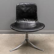 Stoel met zwarte lederen kuipzitting op rvs driepoot, ontwerp Poul Kjærholm, uitvoering Ejvind Kold Christensen, jaren '60 -slijtage aan lederen bovenrand-, 74 × 56 × 60 cm