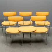 Vijf stoelen met gele bekleding, staand op dunne verchroomd stalen poten, uitvoering Thereca, plus reservezitting, 77 × 50 × 50 cm