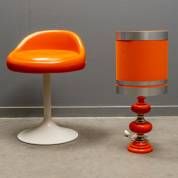 Krukje op draaibaar onderstel met oranje vinyl bekleding, en oranje gelakte tafellamp, beide jaren '60, krukje 59 × Ø 42 cm