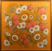 Ingelijste bedrukt zijden sjaal met bloemdecor op oranje fond, gemerkt Salvatore Ferragamo, 87 × 87 cm