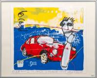 Herman Brood (1946-2001), 'Porsche 911', zeefdruk 90/500, l.b. gesigneerd en l.o. gemonogrammeerd, achterop voorzien van foto's en inscripties: het muzikantenleven van Herman Brood en Lourens Leeuw, 35 × 39 cm