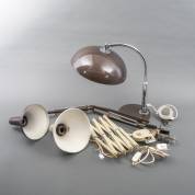 Drie lampen: bureaulamp met ronde voet, bureaulamp met klem, en scharende wandlamp, alle uitvoering Hala, Zeist