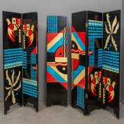 Zespas gelakt kamerscherm met decor van vogels en geometrische patronen, art deco-stijl, tweede helft 20e eeuw -enkele scharnieren los, kleine defecten aan lakwerk-, zes keer 182,5 × 40,5 cm, herkomst: Sotheby's Amsterdam, The Anne Paul Brinkman Collection, 17 september 2002