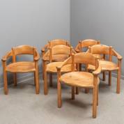 Zes blank naaldhouten armstoelen, ontwerp Rainer Daumiller, uitvoering Hirtshals Savværk, Denemarken, jaren '70 -zitting van één stoel gelijmd, andere stoel met speling, alle met gebruikssporen-, 75 × 60 × 46 cm