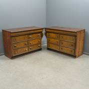 Een paar eikenhouten ladeblokken met aan iedere kant zes lades, de uiteindes gedragen door voluten, 19e eeuw -gebruikssporen, aanpassingen van later datum-, 88 × 266 × 59 cm