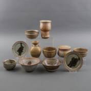 Richard Batterham (1936-2021), keramisch vaasje en kommetje, de kom met gesneden zijdes, daarbij enkele andere stukken gebruikskeramiek in zijn stijl maar mogelijk niet van zijn hand, jaren '60-'70, met kopie aankoopbewijs, formaat vaasje: 16 × Ø 10 cm
