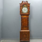 Staand horloge in ingelegde eiken kast, de beschilderde wijzerplaat met Bijbelse scène: de opwekking van Lazarus, adres weggesleten, Engeland, 18e eeuw -zonder slinger en gewichten-, 227 × 57 × 22 cm