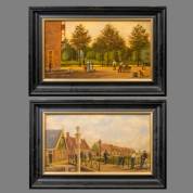 Twee schilderijen, Hollandse School: bedrijvigheid in het park en op de brug, olieverf op doek, r.o. gesigneerd H. Everout en gedateerd 1900 maar mogelijk van later datum -enkele plekjes verfverlies-, 25 × 44 cm