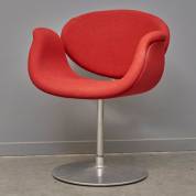 Draaistoel met rode stoffen bekleding op chromen voet, model Little Tulip, F549, ontwerp Pierre Paulin, uitvoering Artifort, -gaatje in de stof, verkleurd, sleets op de armleuningen-, 77 × 63 × 58 cm