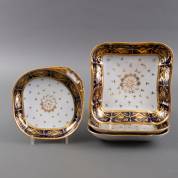 Drie porseleinen vierkante dienschalen en één dienschaal met 'beau bleu' en verguld decor, vermoedelijk uitvoering Porcelain de Paris, Frankrijk, eerste kwart 19e eeuw, vierkante schaal 24 × 24 cm, herkomst: koning Louis Philippe (volgens overlevering), graaf van Bylandt, en privécollectie van kunsthandelaar Abraham van der Meer (1927-2008), destijds gevestigd op de Spiegelgracht 3 te Amsterdam