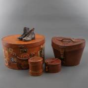 Lederen hoedenkoffer, hoedendoos, kragendoosje, boordendoosje en kinderveterschoentjes, eind 19e, begin 20e eeuw -gebruikssporen-, koffer 26,5 × 45,5 × 41 cm