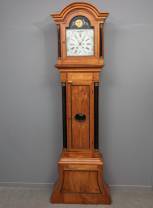 Groot staand horloge in kersenhouten kast, de wijzerplaat met achterglasschildering en in de hoeken volledige kalender, daarboven maanaanduiding, speelwerk op 15 bellen, slagwerk op twee bellen, gesigneerd M. Raetsen à Heijthuijsen, Limburg, eerste helft 19e eeuw, inclusief drie gewichten, slinger, bijgevoegd: twee gezwarte voorpoten -speelwerk van later datum-, 267 × 83,5 × 30 cm