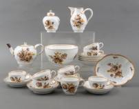 Porseleinen theeserviesgedeelte met vergulding en bloemdecor in bruintinten, uitvoering Meissen, Marcolini-periode, bestaande uit: theepot, melkkan, suikerschaaltje, spoelkom, theebus, acht kop-en-schotels, en één kopje in afwijkend formaat -defecten en restauraties-, spoelkom 9 × Ø 16,5 cm