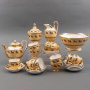 Porseleinen theeservies met bloemdecor op geel font, bestaande uit: theepot, kandijkom, roomkan, spoelkom, tien kop-en-schotels, en één losse schotel, uitvoering La Courtille, Parijs, begin 19e eeuw -enkele chips en haarlijnen-, hoogte koffiepot 18 cm