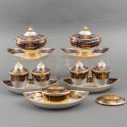 Paar porseleinen schuitvormige zuurstellen, paar kleine terrines en een schuitvormige botervloot met extra losse deksel, voorzien van 'beau bleu' en verguld decor, vermoedelijk uitvoering Porcelain de Paris, Frankrijk, eerste kwart 19e eeuw -defecten-, terrines 16 × 25 × 16 cm, herkomst: koning Louis Philippe (volgens overlevering), graaf van Bylandt, en privécollectie van kunsthandelaar Abraham van der Meer (1927-2008), destijds gevestigd op de Spiegelgracht 3 te Amsterdam