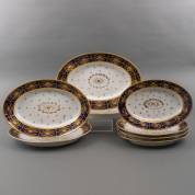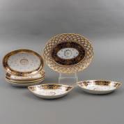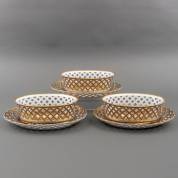 Porseleinen onderschotel met opengewerkte rand, vier ovale dienschaaltjes en paar schuitvormige schalen, met 'beau bleu' en verguld decor, vermoedelijk uitvoering Porcelain de Paris, Frankrijk, eerste kwart 19e eeuw, maat onderschotel 32 × 26 cm, herkomst: koning Louis Philippe (volgens overlevering), graaf van Bylandt, en privécollectie van kunsthandelaar Abraham van der Meer (1927-2008), destijds gevestigd op de Spiegelgracht 3 te Amsterdam